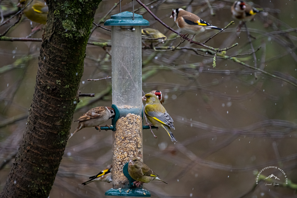 Stieglitze, Buchfinken, Grünfinken, Bergfinken, Kernbeißer, Rotkehlchen, Blau- und Kohlmeise, Weidenmeise, Feldsperlinge und viele mehr…